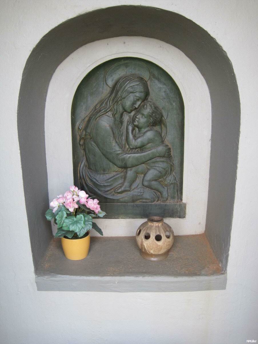 In einer Rundbogennische der rückwärtigen Wand ist eine Reliefplatte aus Bronze, ebenfalls mit rundbogigem Abschluss, angebracht. Hierauf sind Maria und das Christuskind, das sie in ihren Armen hält, dargestellt. Das Relief stammt nicht aus dem Jahre 1869, sondern es wird anlässlich einer Neueinweihung der Kapelle Mitte der 30er Jahre angefertigt. Bei dem Kapellchen werden in der Regel Maiandachten abgehalten.