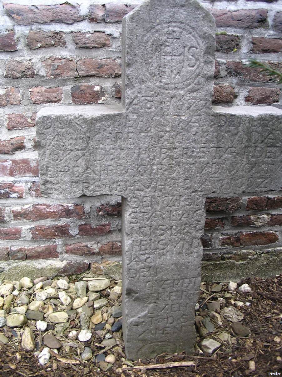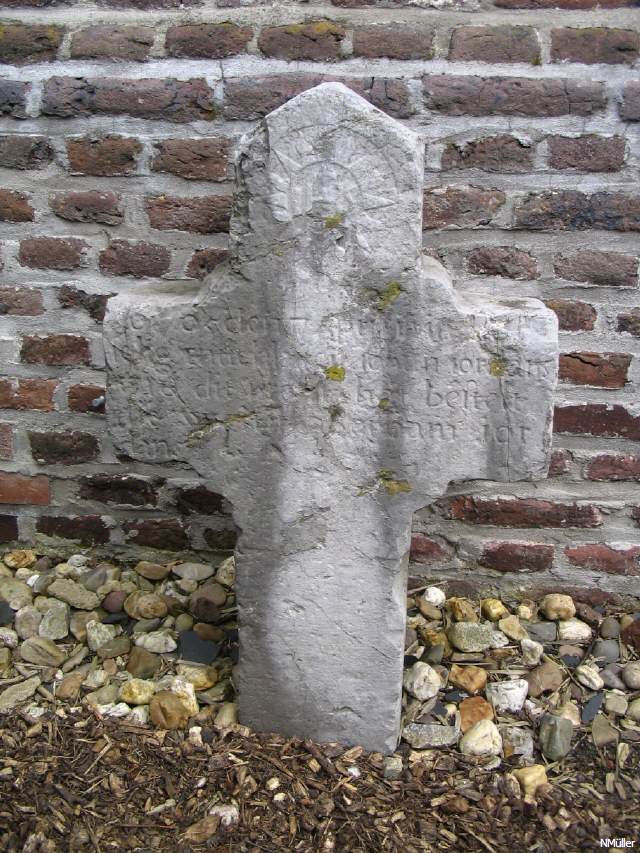 Sandstein ehemaliges Grabkreuz des Friedhof Arsbec Inschrift