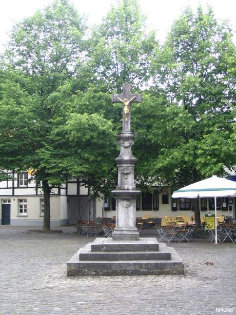 Die inschrift besagt, das die Familie des Mathias Inderfurth das Kreuz aufgestellt hat. Zu dieser Zeit war der Beecker Friedhof rund um die Kirche. Nach ebnung und Umbesttung erhielt das kreuz 1847 seinen jetzigen Standort. aus VI ebenda