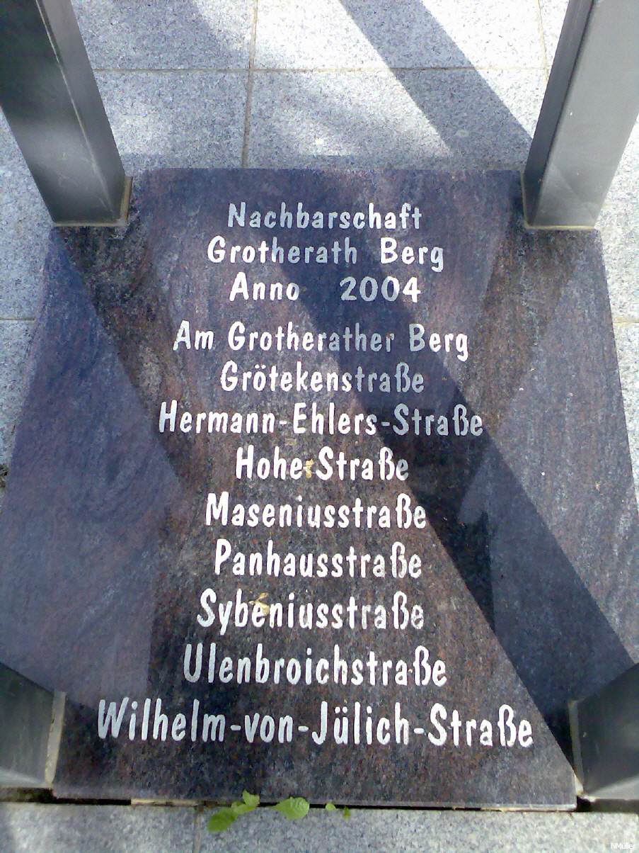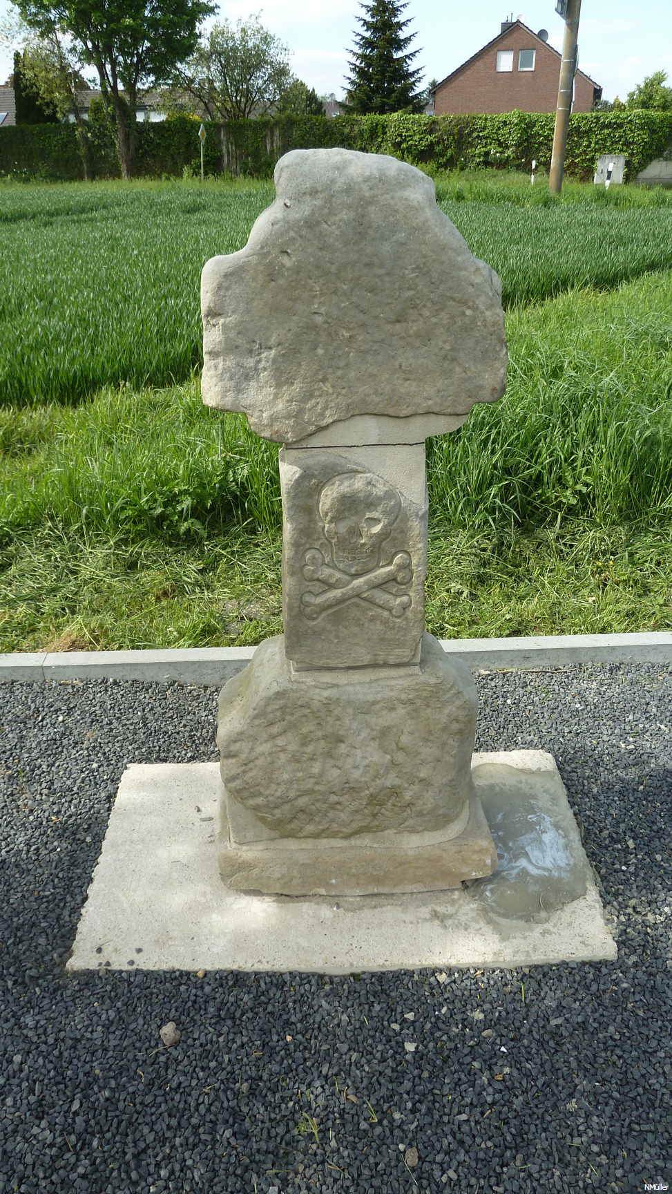 "Das Sühnekreuz stammt aus dem Jahr 1674. Die Franzosen ließen es - wie alle religiösen Zeichen - 1794 zerstören. Die Einzelteile wurden in der Erde verscharrt. Diese tauchten im Laufe der vielen Jahre nach und nach wieder auf. Und nach vielen Vorarbeiten konnte das Denkmal am 27. April 2018 wieder errichtet werden.Mit dem Kreuz hat der Rheindahlener Vogt Peter Pang Sühne geleistet. Das ist die Vorgeschichte: Zur Zeit der Flachsernte kam der Vogt an dem Bauern und seinen fleißigen Flachshelfern vorbei. Diesen wurde zu jener Zeit besondere Hochachtung entgegengebracht. Es gehörte sich, dass jeder Vorbeikommende sie mit den Worten "Gott help öch, ehr Hiäre!"grüßte. Der hochnäsige, wenig beliebte Peter Pang verweigerte den Gruß und wurde daraufhin vom Jungbauern als Schuft bezeichnet. Derart beleidigt, zog Peter Pang seinen Dolch und stach ihn dem jungen Mann in die Brust. Er starb in den Armen seines Vaters. Der Jülicher Landesherr, dem Peter Pang seine Schuld eingestand, hätte das Recht gehabt, den Vogt mit dem Tod zu bestrafen. Er ließ allerdings Gnade walten. Peter Pang verlor Amt und Stellung, musste eine hohe Strafe zahlen und an der Stelle, an der er zum Mörder wurde, ein Kreuz errichten..