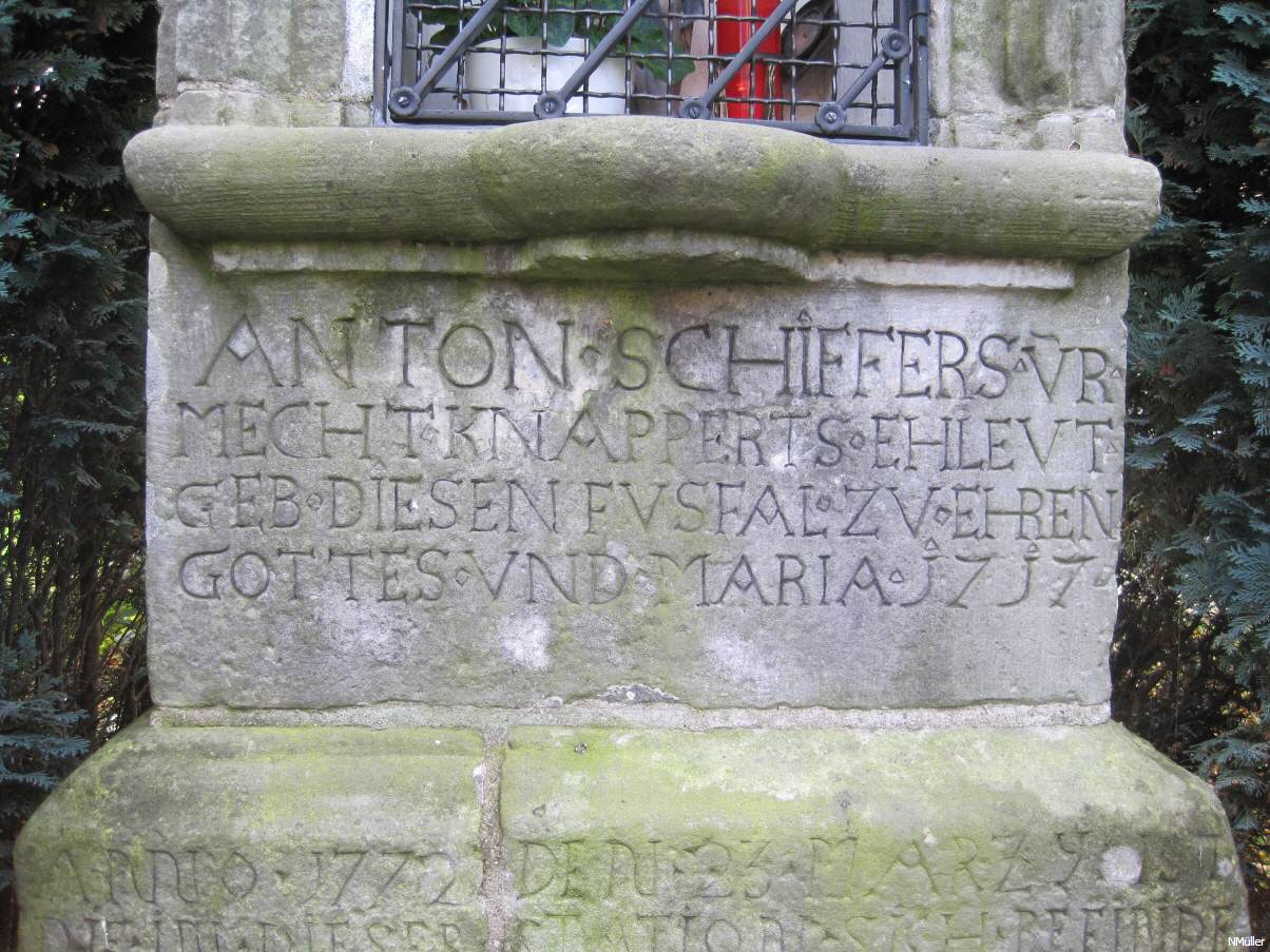 ANTON SCHIFFERS VR MECHT KNAPPERTS EHLEVT GEB DIEEN FVSFAL ZV EHREN GOTTES VND MARIA 1717...................ANNO 1772 DEN 23 MARZY IST DIEC IN DIESER STATION SICH BEFINDENDE SCHILDERJ VON DEN HERRN P P MISSI ONA:::ERKANNT UND GEBEMITIECKCIREI WORTEN ZU KORSCHENBROICH |
