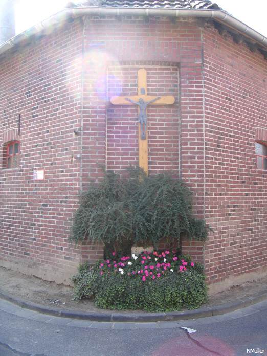 Das Bet- und Bittkreuz am Haus Alst 85a trägt die Inschrift: "Auch in der Hast unserer Zeit denk an die Ewigkeit." Das genaue Alter ist nicht bekannt, es kann jedoch davon ausgegangen werden, dass es ebenfalls Ende des 19. Jahrhunderts errichtet wurde. Im Zuge des Umbaus der Scheune (Feldes) in das heutige Wohnhaus im Jahre 1955 wurde das Kreuz renoviert und am 16. September 1956 wieder neu eingeweiht. aus http://www.schuetzenboerholzalst.de/boerholzalst/boerholzalst.html |