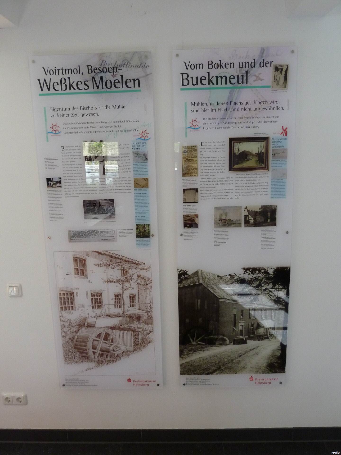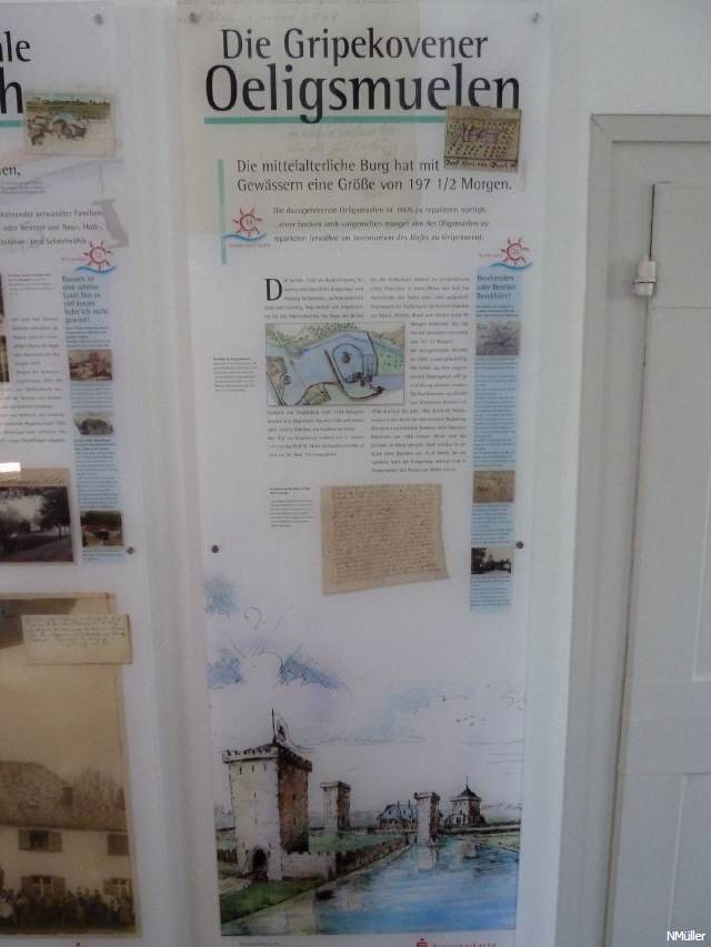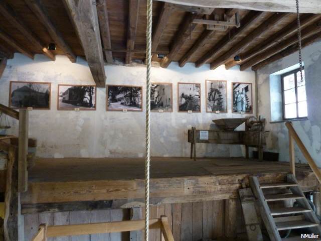 Getriebeaufbau. Gerüst, das die Kraftübertragung vom Wasserrad zu den einzelnen Anwendungen regelt. es können 2 Mahleinrichtungen und eine Ölpresse angesteuert werden |