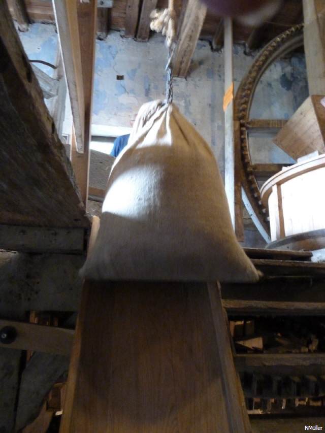 Sich drehender Mühlstein mit ausgestoßenem Mehl |