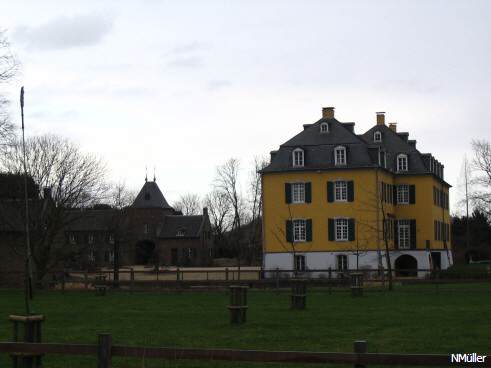 Über die mittelalterliche Vorgängeranlage ist nichts bekannt, ein spätgotisches Burghaus ist seit 1510 urkundlich bezeugt. Es soll Ecktürmchen und einen kleinen Innenhof besessen haben: Diese Beschreibung bezieht sich auf eine Zeichnung von 1702, die sich im Archiv der Freiherren Spies von Büllesheim befindet. Deren Zuverlässigkeit ist genauso wie die Abbildung einer großen zweiteiligen Anlage im Codex Welser von 1723 nicht mehr nachvollziehbar. Jedenfalls entstand 1785 durch Abriss und Umbau das heutige Herrenhaus. Die Seitenflügel wurden 1904 angefügt. Die als Wirtschaftshof genutzte Vorburg besitzt Torbauten von 1769 und 1782. Der Nordostflügel mit der großen Scheune stammt von 1828 und wurde an Stelle eines Fachwerkbaues errichtet. (Markus Westphal)
