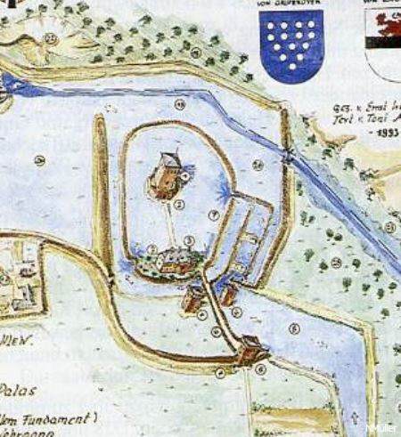 Die Verbindung von der Haupt- zur Vorburg erfolgte über eine Holzbrücke, zu der in der Vorburg eine fünf Meter breite Erdrampe von rund 20 Metern Länge führte. Eine solche Rampe kommt bei Motten selten vor. Neben anderen Hinweisen zeigt dies die Bedeutung des Adelssitzes, der schon um oder vor 1200 ein bedeutendes Machtzentrum gewesen sein dürfte. Untermauert wird diese Annahme durch archäologische Funde, wie Keramikscherben des 11./12. Jahrhunderts und einen gut erhaltenen graublauen Kugeltopf, die bei Ausschachtungsarbeiten im Burgbereich zutage kamen. Im Osten war die Anlage durch einen rund 50 Meter breiten und fünf Meter tiefen Wassergraben gesichert. Im Westen war nur ein Trockengraben von fünf Meter Breite vorhanden. Nachdem der Alsbach im 15. Jahrhundert in sein Bett zurück verlegt wurde, entstanden im Bereich der ehemaligen Wassergräben Hofgebäude. Zum Auffüllen der Gräben wurde wohl auch die Motte zum größten Teil abgegraben. (Markus Westphal)