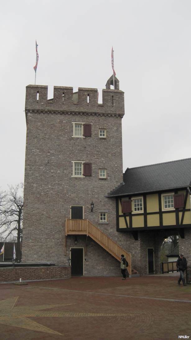 | Sicht von Herkenbosch, erkennbar der Donjon in diesem Fall kein Donjon, nur ein (Über-) Eckturm der Hauptburg, genannt\"de Overhoekse\ . In September 2012 ist den Diagonale Turm mit Torhaus neu-gebaut |